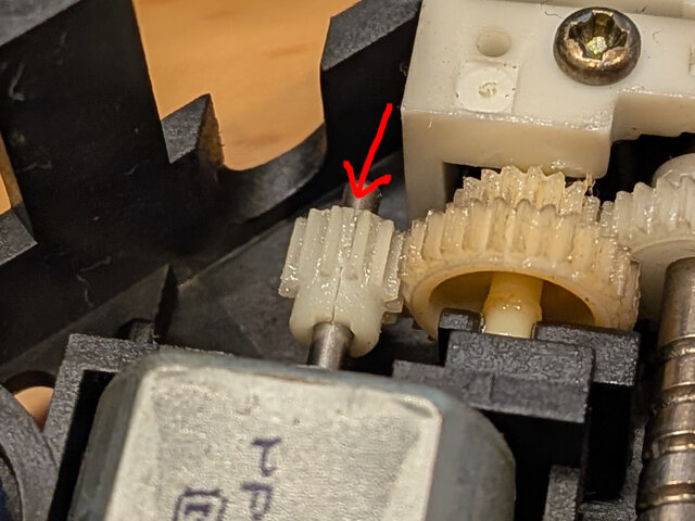 だめな方の認識率を上げられないかと思い、分解してみたところ、なんとピニオンギアに亀裂がw。というか割れてる?それでもGD-ROMの読み出しに関してはまったく問題ない感じですが。ひょっとして、このドライブのシーク音が、もう一台に比べてやたらと大きいのはこのせい?w