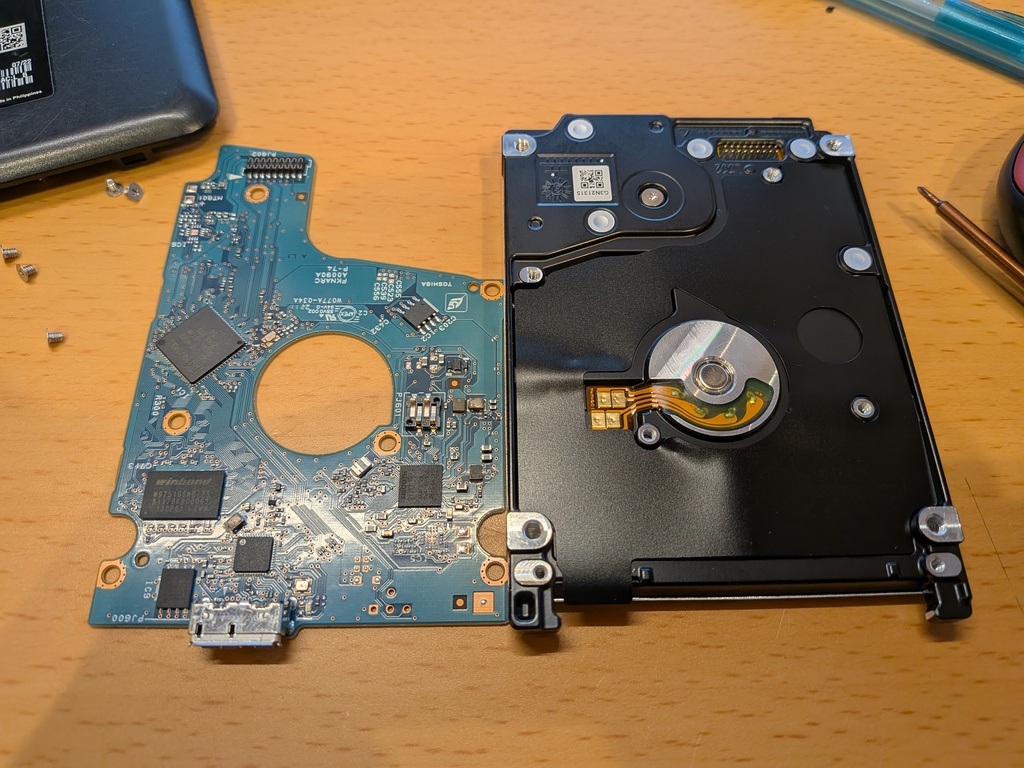 中でHDDとI/F変換基板の間の接続が緩んでいたりしないかなと思って開けてみました。が、そもそもHDDの制御基板に直接USB端子がついてることが判明・・・w