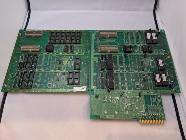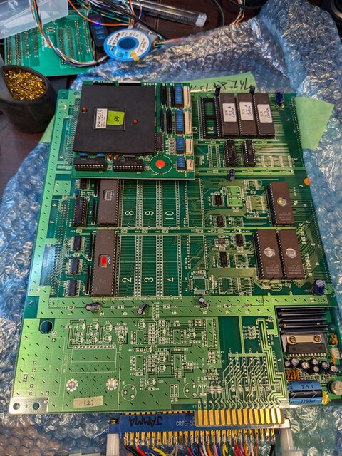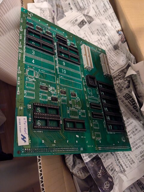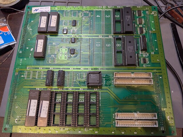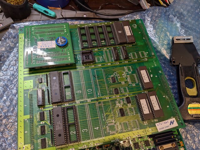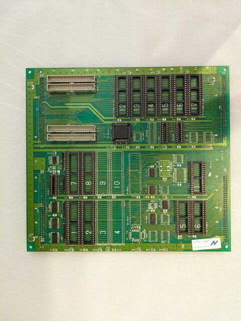 94916-10に一通り装着して準備完了。基板自体は、先日殿様の野望2を動かした際にスクランブル解除を無効化したままなので、元の基板のプログラムROMをそのまま載せてあります。また、サウンドROMに関しては、基板側が非JEDECの1Mbit ROMしか使えない仕様だったので焼き直しました (よく考えたら、サウンドプログラムは前の方しか使ってないから、元のままでも使えたか)