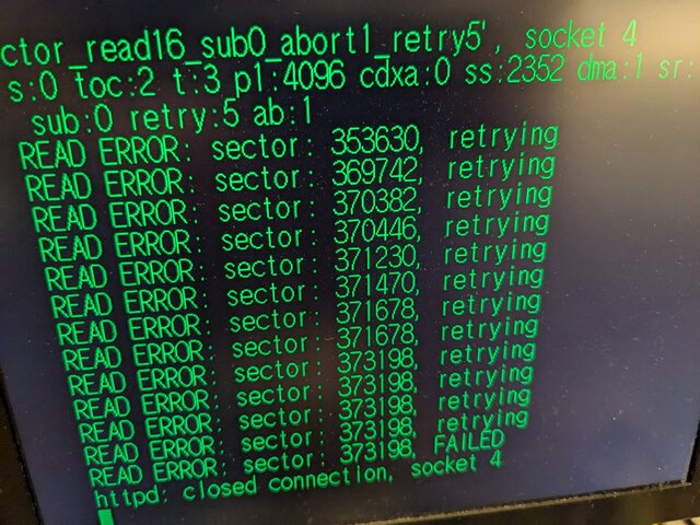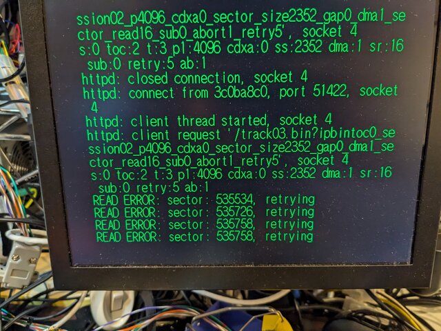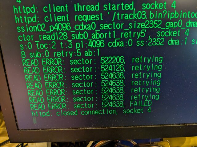メディアを清掃してみましたが、状況は変わらないようです。かなり終盤ですが、前回と同じようなところでリトライに失敗して終了しました。ドリキャス本体を変えても状況に変化なし。うーん。