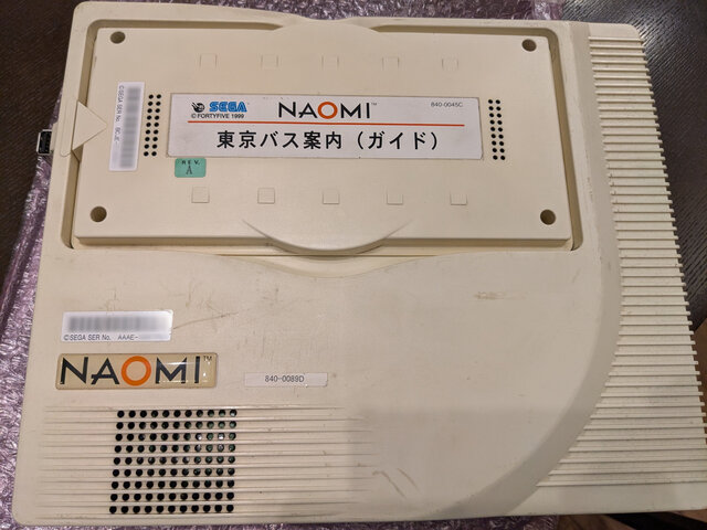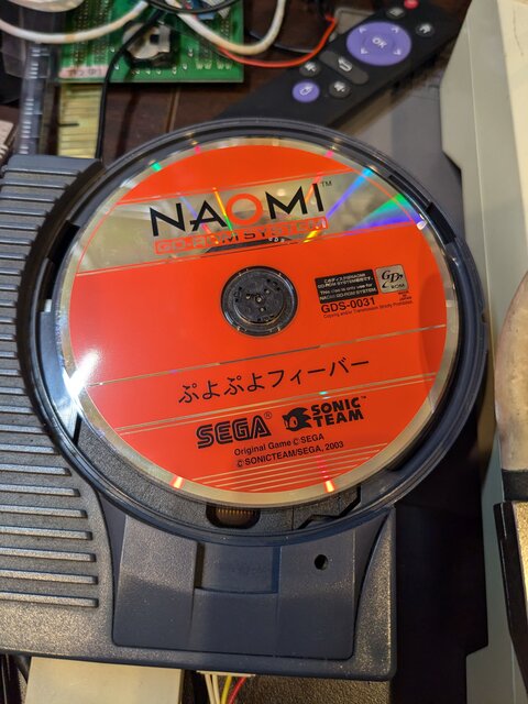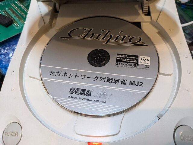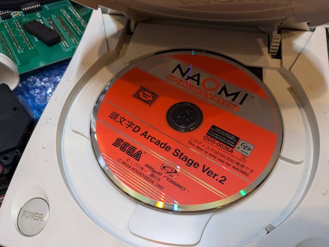 こりゃ壊したかと、青ざめつつNAOMIに読み込ませてみたところ、何とこんな状態でもやっぱりエラー等なくすんなり立ち上がります。やはりNAOMIのGD-ROMドライブには何かがあるのでは・・・。