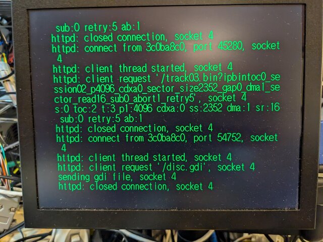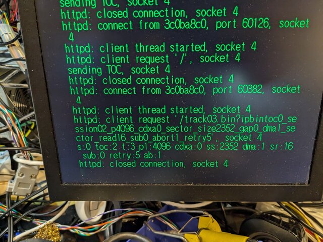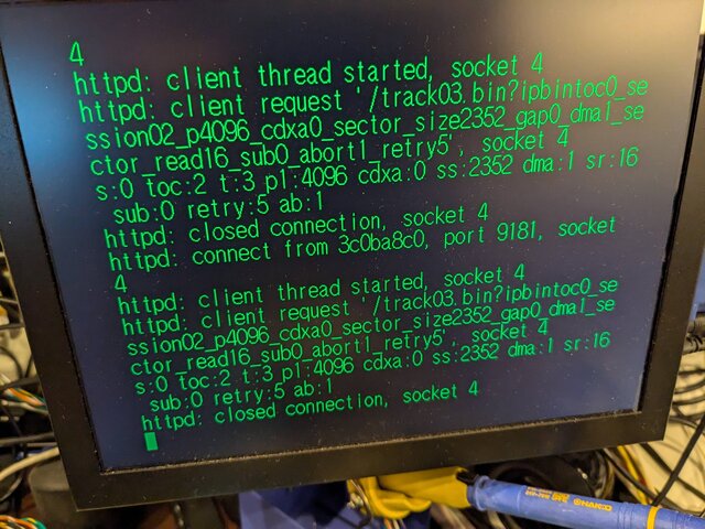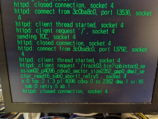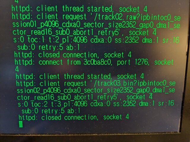 前回どうやってCD-Rにhttpd-ackのCDI形式のイメージを書き込んだのかまったく思い出せないんですが、ImgBurnにプラグインを入れてブランクメディアに書き込んでみたところ、無事新しくゲットした方のVA1基板の本体でもhttpd-ackが起動してくれるようになりました (書き込み直後に、一度だけ起動に失敗したのはちょっと気になりますが)。これでようやく検証を始められそうです。