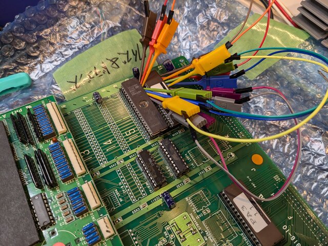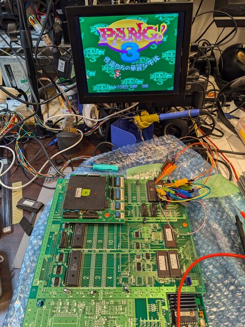というわけで、CPLDの37番ピンが常にHになるようにPALを修正した上で、後半5個のプログラムROMのデータバスの下位8bitをマザーボード側のデータバスに直結。この状態で、スクランブルを解除したパン!3のROMを装着して動かしてみます。バスの直結はひとまずプローブでw