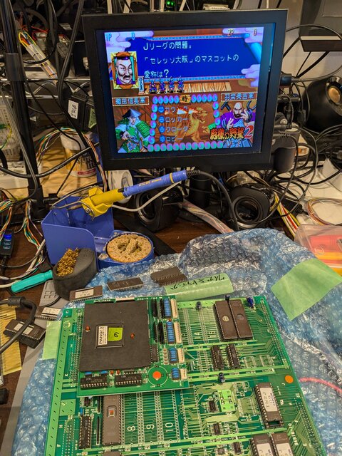 昨日作ったパン!3のスクランブル関数を利用して、クイズ殿様の野望2のプログラムROMにスクランブルをかけて、パン!3の基板に乗せてみました。グラフィックデータは結合して16MbitのROMに焼いてます。MAMEのソースを見る限り、PALはそのままでいけるはず。