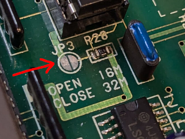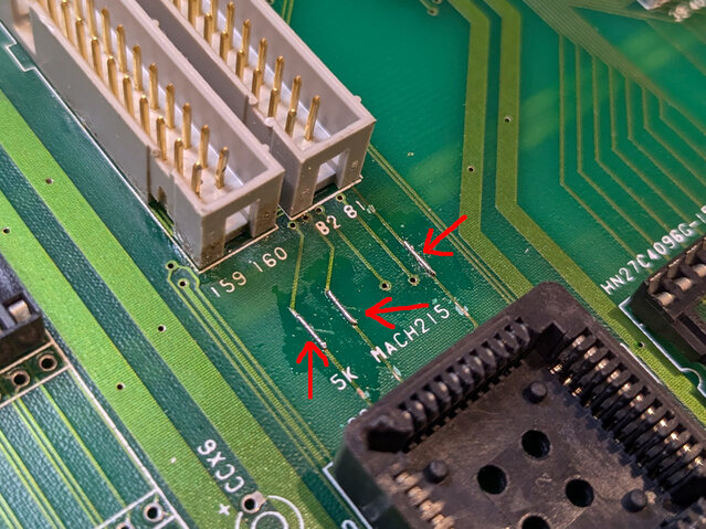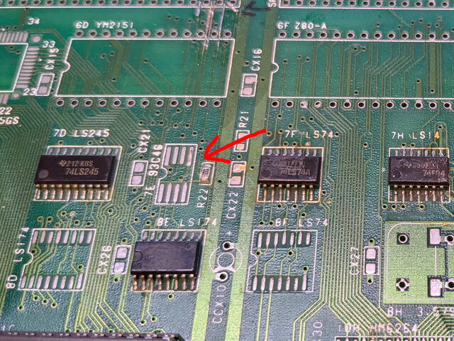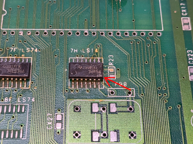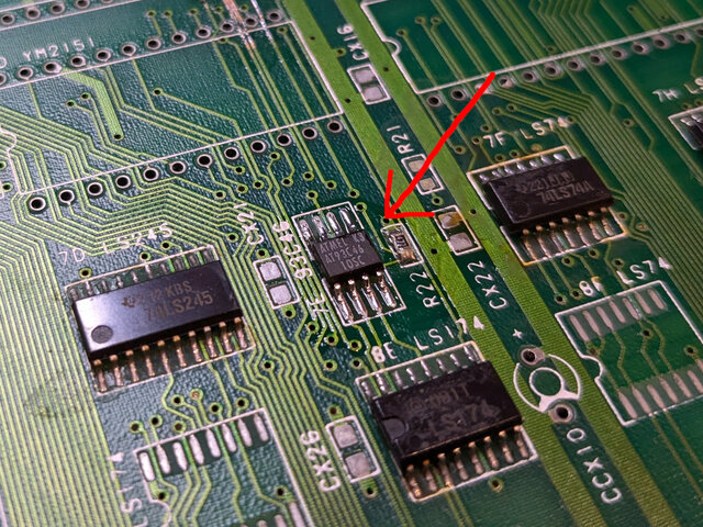 ショートさせました。こうすることで、これまで64bitのグラフィクデータの前半32bitと後半32bitを切り替えるCボードからの信号に連動するのがA19からA20に変更となり、32MbitのROMが全域使えるようになります。