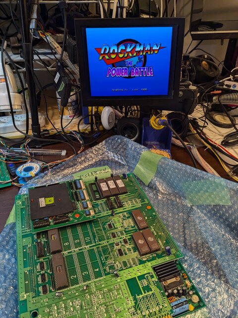 今日はパン!3のサブボード (94916-10) を使ってロックマン ザ・パワーバトルを動かすことに挑戦してみます。ロックマン ザ・パワーバトルはグラフィックROMがパン!3の倍の64Mbitで、CPSチェンジャーのストゼロと並んでCPS1で最大容量だったりします。ストIIダッシュやマッスルボマーよりも多いというのが何だか不思議な感じですねw