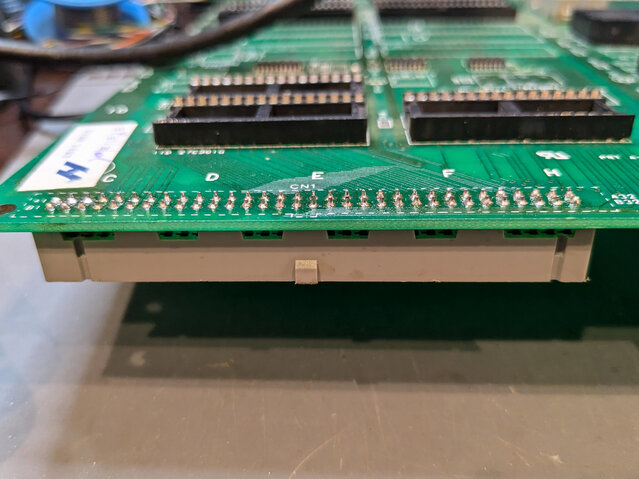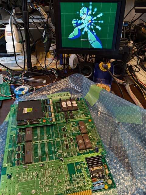 そのままコピー基板の方に部品を移植したらパン!3が動くかも?と思ったんですが、コピー基板の方は激しく改造されていて、パターンカットとジャンパだらけw。さらに、写真左下のコネクタが、(意図的なのか否か不明ですが) 逆向きに実装されていて、普通のCPS1マザーに素直に刺さりませんw。何かを試すなら、この辺を全部戻してからですね。