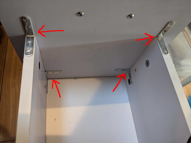 で、どうしたもんかと思っていたところ、今日、ダイソーに行ったらちょうどいい感じのL字の金具を発見。これで正面のパネルを固定してやれば、十分な強度が出そうです。というわけでL字の金具と木工ボンドでこんな感じに修理してみました。