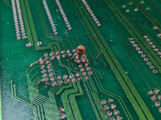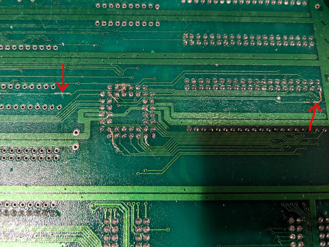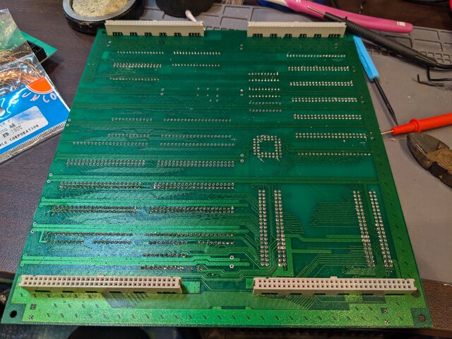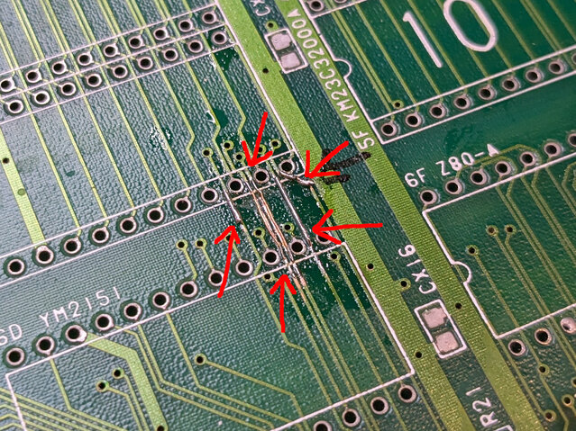 パン!3のROMボード (94916-10) のデッドコピー基板の、キャディラックスの海賊版を動かすために施されたと思われる改造 (ややこしい) を戻してみます。といっても、ジャンパ線を外した後、カットされたパターンをひたすら繋いでいくだけですが。