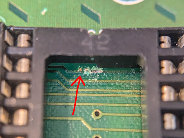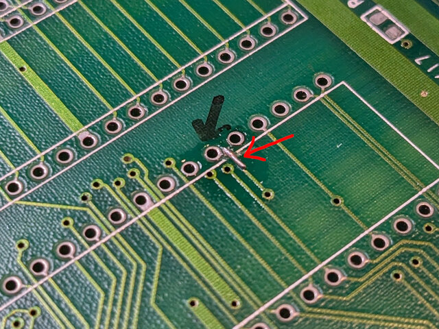 パン!3の基板のデッドコピーっぽいコピー基板でパン!3が動かない問題、未修正のパターンカット箇所が見つかりました。グラフィックROMのソケットの陰のここ。