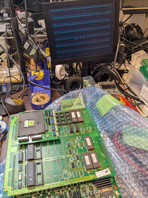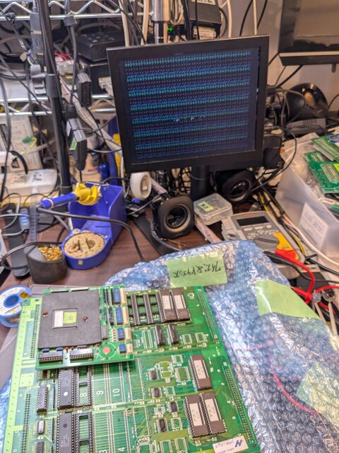 プログラムROMのデータバス直結を解除し、CPLDを再度取り付けて、電源オン・・・うおお、ついにパン!3が起動した!w。改造されたデッドコピー基板をオリジナル相当に戻したことで、無事起動してくれました。