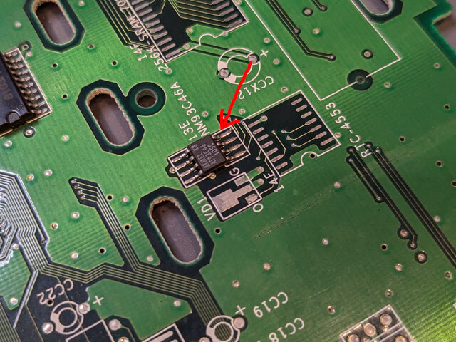 EEPROMへのアクセスにはCPLDが介在するので、CPLDを外しているとこのメッセージが出ちゃうんだとは思いますが、そもそもコピー基板だけあってか、この基板にはEEPROM (93C46) が実装されていないんですよね。