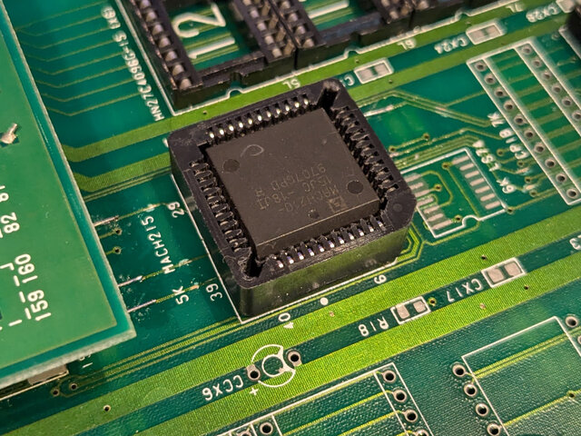 - 最初の1個を除いた5個のROMのデータバスの下位8bitは、マザーボード側のデータバスに直結しておらず、CPLD (MACH215) を経由する必要がある