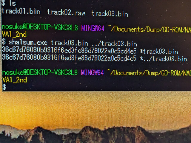 何と一切のリトライもなく完走しました。まじか。SHA-1を確認してみると、redump.org のデータベースにある値 (36c67d76080b9316f6ed3fe86d79022a0c5cd4e5) と一致しました (むしろ先日、ヤマハのドライブユニットで2回に分けてダンプしたものを結合した方 (上の方) が一致していませんw)